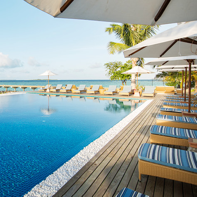 Lass die Schuhe zu Hause, laufe barfuß und fühle den feinsandigen Strand einmal rund um die wunderschöne Insel! Genieße den Sundowner auf der Landzunge, speise stilvoll im Teppanyaki-Restaurant auf Stelzen im Wasser oder tauche ab auf einer Tauchtour im spektakulären Noonu-Atoll.